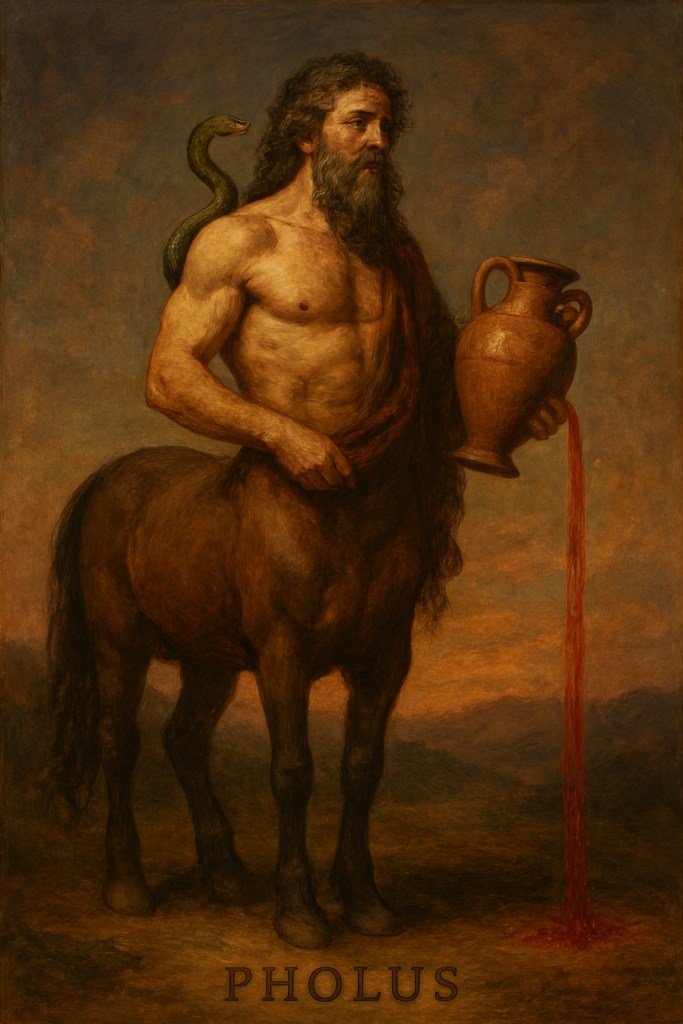 Pholus was a wise centaur and the guardian of a sacred jar of wine gifted by Dionysus. When Heracles visited, Pholus opened the jar—an act that triggered chaos!! The scent drew other centaurs, leading to a violent clash and Pholus’s own accidental death.
