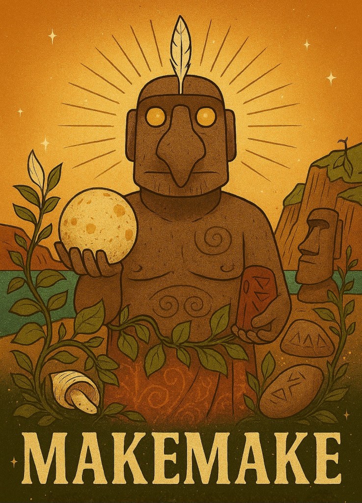 In myth, Makemake was a life-giver and a trickster, a figure who shaped the world and governed sacred rituals tied to nature’s cycles. The Birdman competition, held annually, was a spiritual and political rite where competitors retrieved the first egg of the season from a distant islet, symbolizing renewal and divine favor.In astrology. Makemake carries this duality: it’s a symbol of ecological consciousness, spiritual leadership, and the tension between tradition and innovation. Discovered in 2005, Makemake orbits beyond Pluto and resonates with themes of sovereignty, environmental stewardship, and the reclaiming of indigenous wisdom.